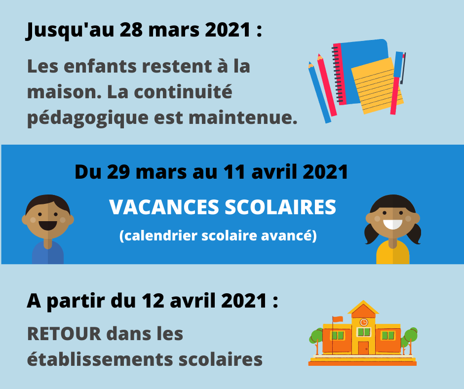 Un accueil pour les enfants des personnels des professions prioritaires a été mis en place dans les écoles pour les enfants dont les 2 parents sont des personnels prioritaires exerçant dans des établissements de santé publics ainsi que ceux chargés de la gestion de l’épidémie Covid-19.