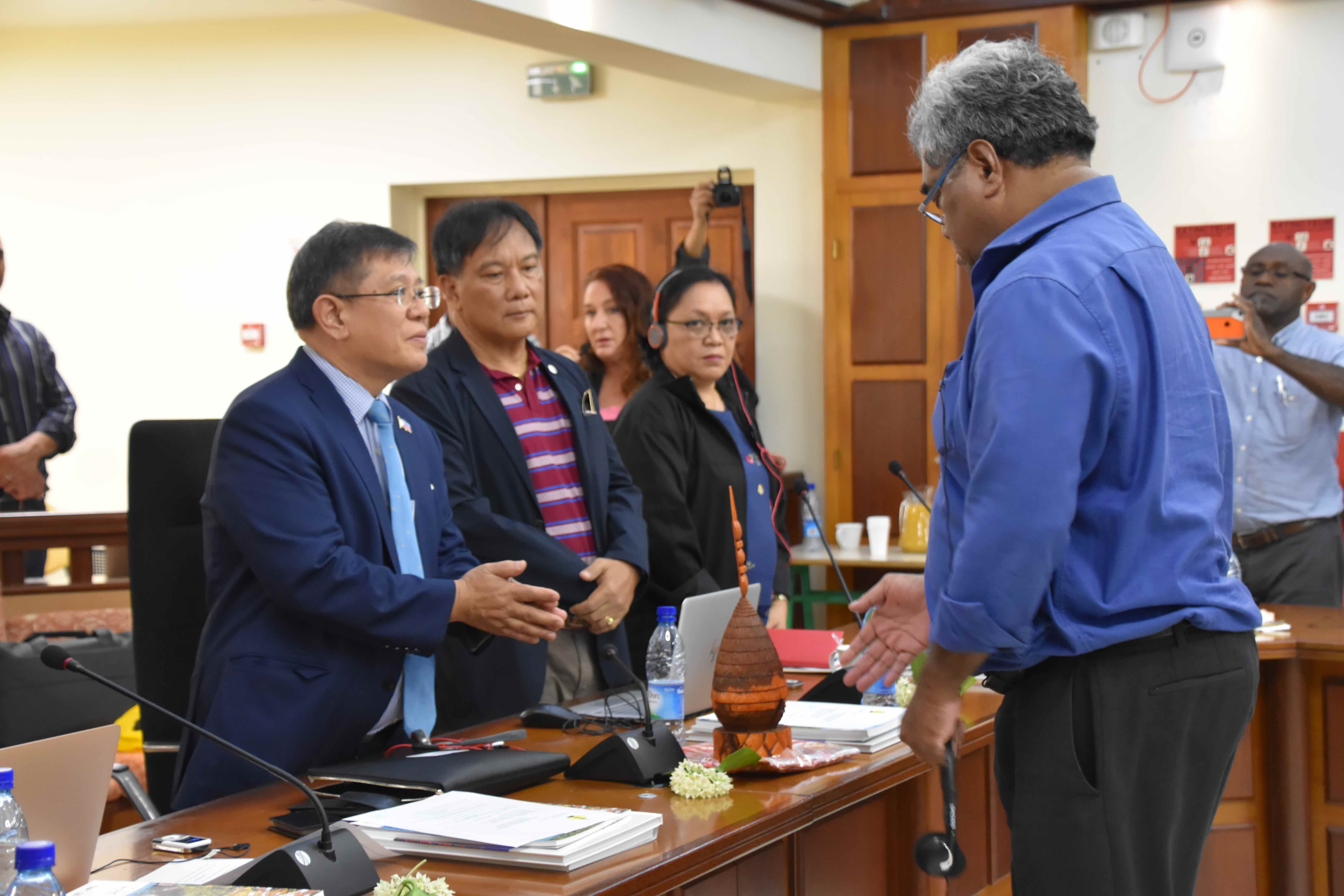 Organisée depuis plus d´un mois, le gouvernement Philippin s´est rendu sur Lifou pour une visite de courtoisie et d´échanges techniques. Après un échange coutumier dans la salle de délibération, le Président Lalié et son excellence, l´ambassadeur José Maria Carino, ont pu échanger pendant plus d´une heure notamment sur la filière COCO et sur le tourisme.